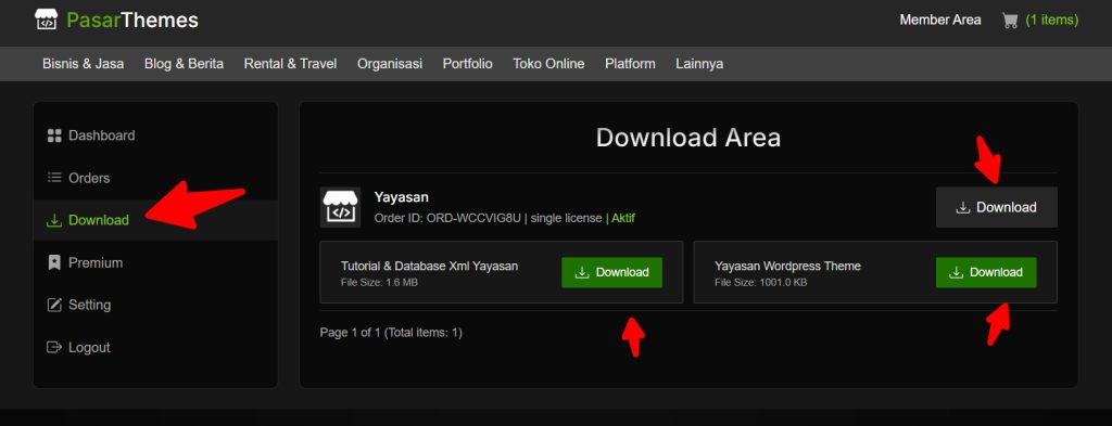 - Setelah pembayaran dikonfirmasi, tema langsung muncul di Download Area Anda.