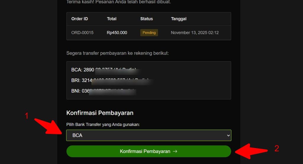 - Setelah itu silahkan lakukan pembayaran dan Klik tombol ‘Konfirmasi Pembayaran’